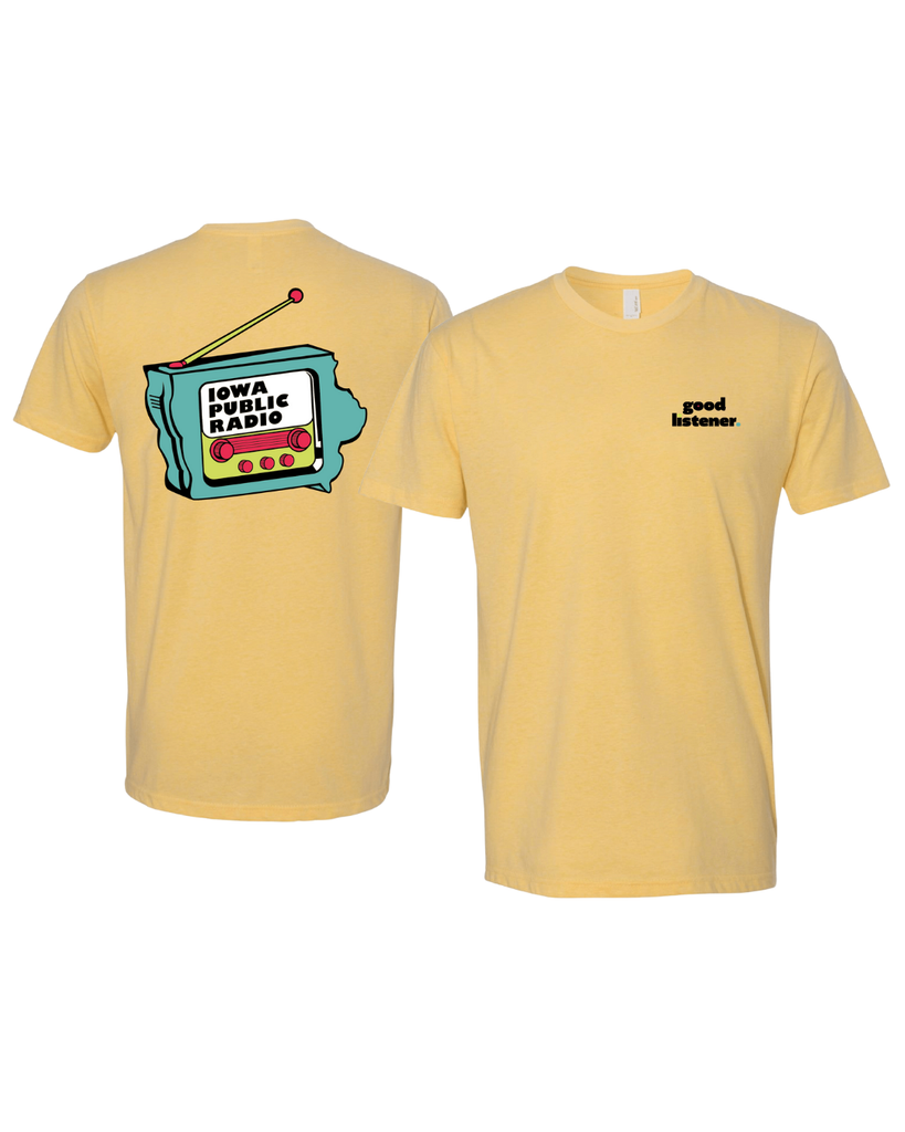 This light yellow, cotton-blend short-sleeve will add some color and fun to your wardrobe. On the front, the shirt features the words “good listener” in black text over the left side of the chest. On the back, you’ll see a vibrant design by Iowa artist Jax Dukes. It features a retro, aqua-colored radio shaped like the state of Iowa, complete with fuchsia tuning dials, light green accents, and the text “Iowa Public Radio” on the screen.