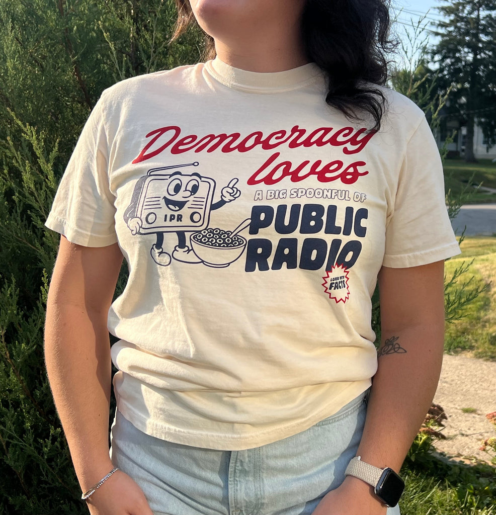 Inspired by retro cereal boxes, this shirt has the words “Democracy loves a big spoonful of public radio” across the chest in red and blue. Balance out your news diet with IPR: Community supported, democracy approved!